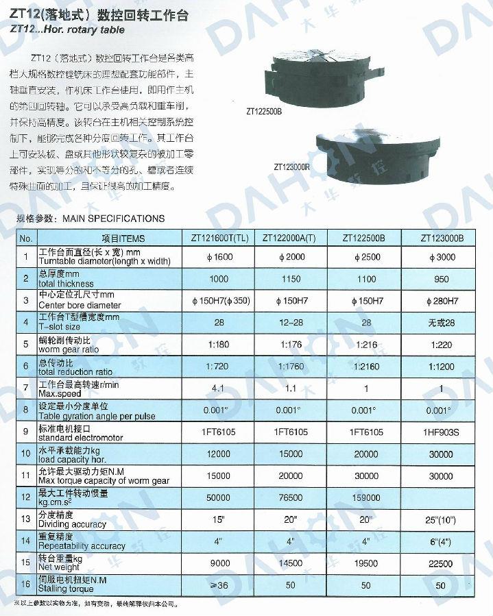 ZT12(落地式)數(shù)控回轉(zhuǎn)工作臺是各類高檔大規(guī)格數(shù)控鏜銑床的理想配套功能部件,主軸垂直安裝,作機(jī)床工作臺使用,即用作主機(jī)的第四回轉(zhuǎn)軸。它可以承受高負(fù)載和重車削,并保持高精度。該轉(zhuǎn)臺在主機(jī)相關(guān)控制系統(tǒng)控制下,能夠完成各種分度回轉(zhuǎn)工作。其工作臺上可安裝板、盤或其他形狀較復(fù)雜的被加工零部件,實現(xiàn)等分的何不等分的孔、槽或者連續(xù)特殊曲面的個,且保證很高的加工精度。