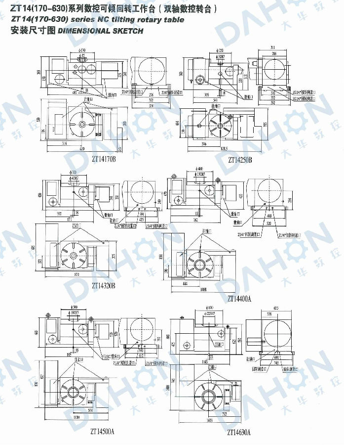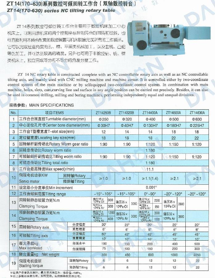 ZT14系列數(shù)控可傾回轉(zhuǎn)工作臺主要用于數(shù)控機床加工中心機床上,可利用原機床的兩個控制坐標控制轉(zhuǎn)臺的回轉(zhuǎn)和傾斜,也可直接利用本轉(zhuǎn)臺配套的數(shù)控裝置與機床聯(lián)接完成所需的工作循環(huán)。它可以完成任意角度的孔、槽、平面類機械加工,以及曲線、凸輪等的加工,并可達到較高的精度。另外也可用于非數(shù)控鉆、銑、鏜類機床上,獨立完成等分和不等分的角度分度工作。該設備是一種雙軸數(shù)控轉(zhuǎn)臺。