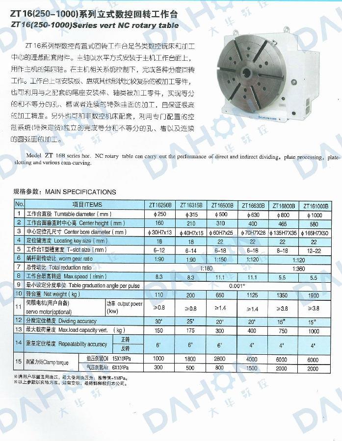 ZT16系列數(shù)控背置式回轉(zhuǎn)工作臺是各類數(shù)控銑床和加工中心的理想配套附件。主軸以水平方式安裝于主機(jī)工作臺面上,用作主機(jī)的第四軸。在主機(jī)相關(guān)系統(tǒng)控制下,完成各種分度回轉(zhuǎn)工作。工作臺上可安裝板、盤或其他形狀比較復(fù)雜的被加工零件,也可利用與之配套的尾座安裝棒、軸類被加工零件,實(shí)現(xiàn)等分的和不等分的孔、槽或者連續(xù)的特殊曲面的加工,且保證很高的加工精度。另外也可和非數(shù)控機(jī)床配套,利用專門配置的控制系統(tǒng)(特殊定貨)獨(dú)立的完成等分和不等分的孔、槽以及連續(xù)的圓弧面的加工。