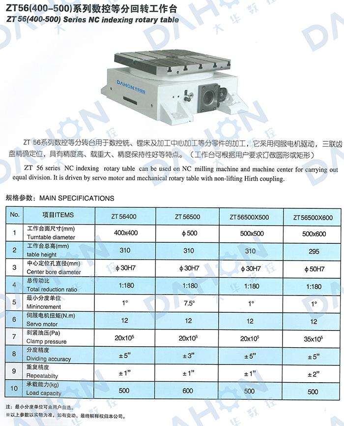 ZT56(400-500)系列數(shù)控等分轉(zhuǎn)臺(tái)用于數(shù)控銑、鏜床及加工中心加工等分零件的加工,它采用伺服電機(jī)驅(qū)動(dòng),三聯(lián)齒盤精確定位,具有精度高、載重大、精度保持性好等特點(diǎn)。(工作臺(tái)可根據(jù)用戶要求訂做圓形或矩形)